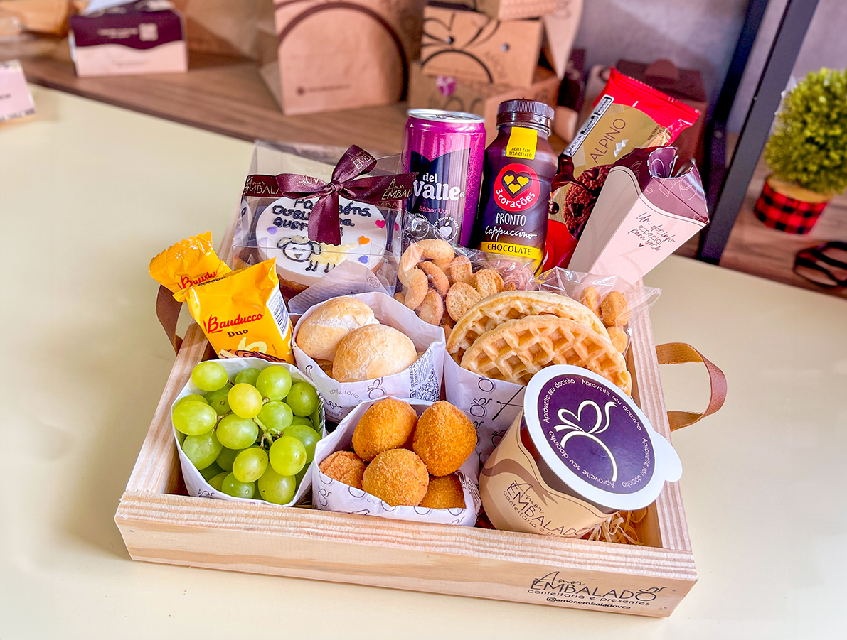 Tudo é apresentado com charme em uma bela bandeja de madeira. Personalize a experiência escolhendo as cores da decoração da cesta. Faça deste café da manhã um presente único e memorável.